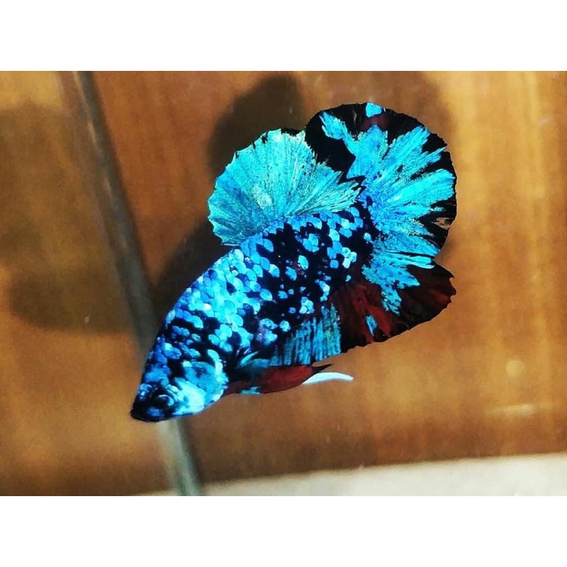 Dengan warna hitam dominan kontras dengan biru dan sekilas warna merah pada sirip dan ekornya.